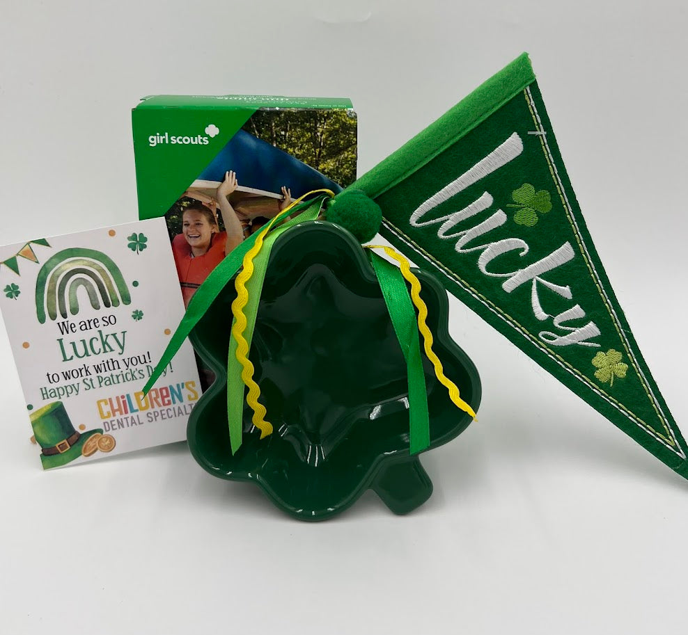 These St. Patrick’s Day gift sets are the perfect touch for clients and referring offices featuring a lucky flag, a charming clover dish, and everyone’s favorite Girl Scout cookies 💚